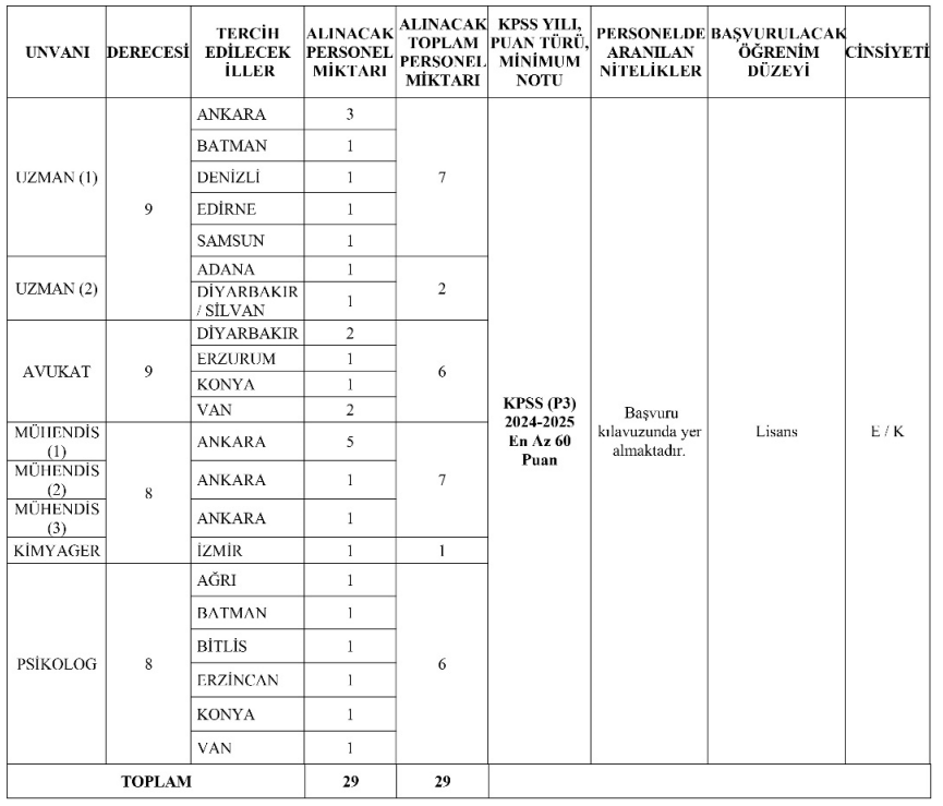 Alımı yapılacak 29 memur kadrosuna ilişkin unvanlar, kontenjanlar, öğrenim şartları ve diğer tüm kriterler başvuru kılavuzunda detaylı olarak açıklanacak. Kılavuzun yayımlanmasıyla birlikte adaylar tüm pozisyonlara erişebilecek.