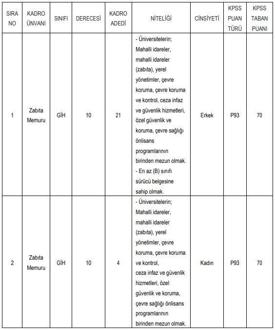 İlanda yer alan iki farklı kadro için toplam 25 erkek ve 4 kadın aday alınacak. Tüm pozisyonlar için aranan eğitim şartı aynı: Üniversitelerin ilgili önlisans programlarından mezun olmak. Bu programlar arasında:
