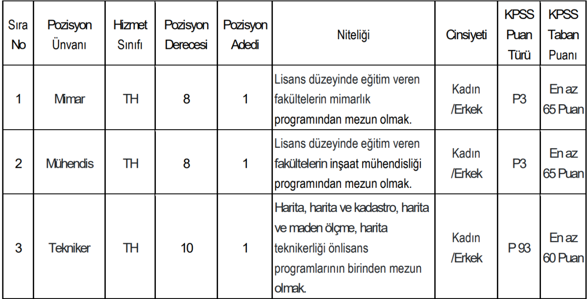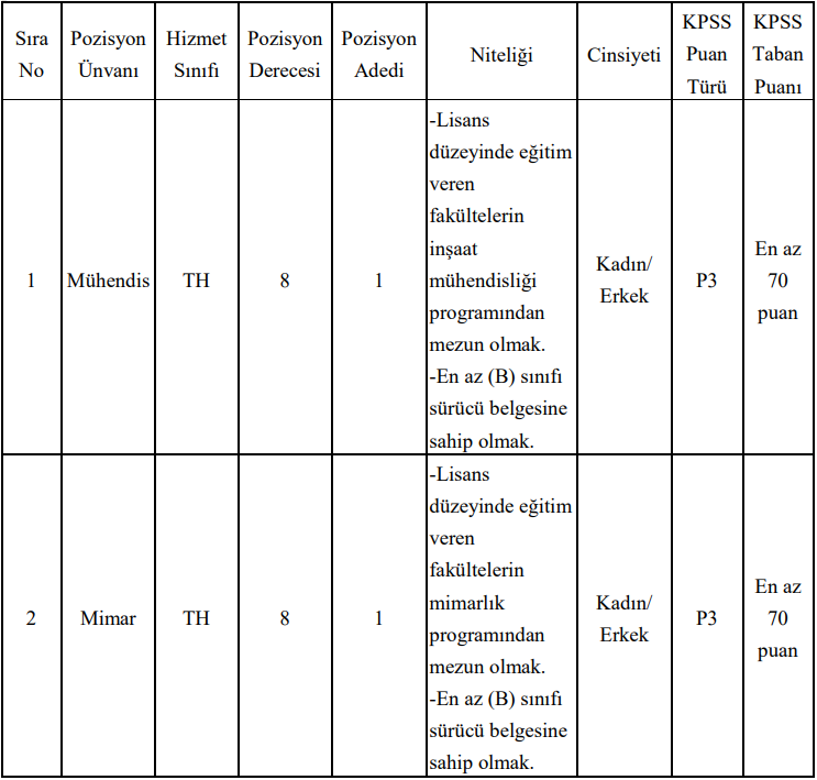 - 1 Mimar – KPSS P3 en az 70 + B sınıfı ehliyet