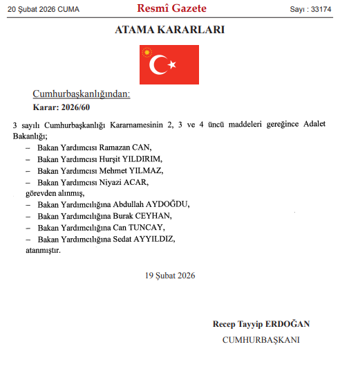20 Şubat 2026 Cuma tarihli Resmî Gazete’de yayımlanan atama kararları kamuoyunun gündemine oturdu. Sayı 33174’te yer alan ve 2026/60 numarasıyla duyurulan Cumhurbaşkanlığı Kararı kapsamında, Adalet Bakanlığı bünyesinde önemli görev değişiklikleri yapıldı.