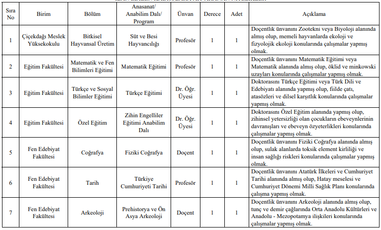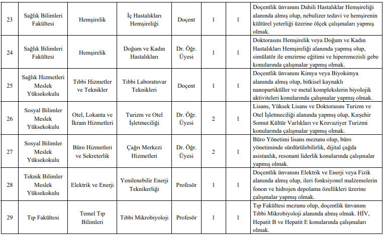 Kırşehir Ahi Evran Üniversitesi öğretim üyesi alımı için başvurular, ilanın Resmî Gazete’de yayımlandığı tarihten itibaren 15 gün içerisinde yapılabilecek. Başvuruların, en geç son gün saat 17.00’ye kadar tamamlanması gerekiyor.
