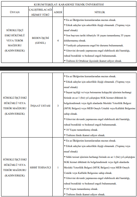 Karadeniz Teknik Üniversitesi (KTÜ) Rektörlüğü, 4857 sayılı İş Kanunu’nun 30’uncu maddesi kapsamında eski hükümlü veya Terörle Mücadelede Malul Sayılmayacak Şekilde Yararlananlar (TMY) statüsünde 8 sürekli işçi alımı gerçekleştireceğini duyurdu. KTÜ Merkez ve taşra teşkilatlarında istihdam edilmek üzere yapılacak alımlar, Türkiye İş Kurumu (İŞKUR) aracılığıyla yürütülecek.
