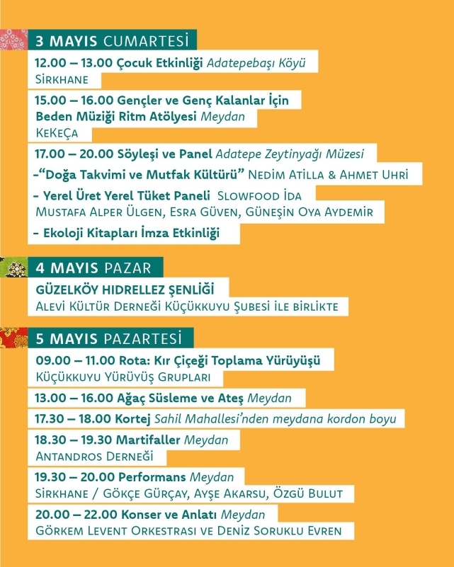 Etkinlikler Adatepebaşı Köyü’nden Küçükkuyu Meydanı’na, Güzelköy’den Sahil Mahallesi’ne kadar geniş bir alana yayılacak. Doğa yürüyüşlerinden panellere, atölyelerden söyleşilere, eski Hıdrellez günlerinin neşesini yaşatacak ritüellerden konserlere kadar birçok etkinlik ücretsiz ve herkesin katılımına açık olacak.