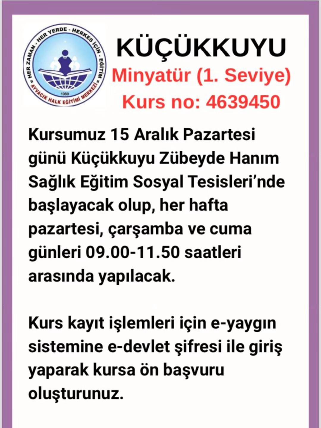 Küçükkuyu Zübeyde Hanım Sağlık Eğitim Sosyal Tesisleri’nde düzenlenecek Minyatür (1. Seviye) kursunun kurs numarası 4639450 olarak açıklandı. Kurs, 15 Aralık Pazartesi günü başlayacak.