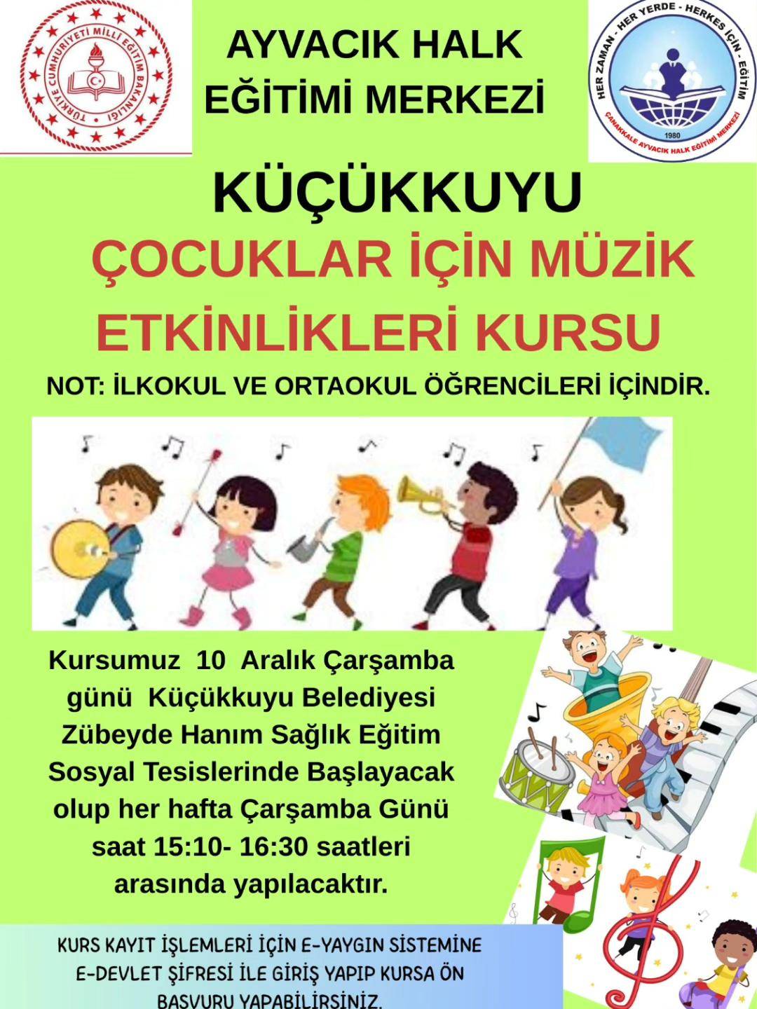 Ayvacık Halk Eğitimi Merkezi’nin duyurduğu ikinci kurs ise çocuklara yönelik müzik etkinlikleri eğitimi oldu. “Küçükkuyu Çocuklar İçin Müzik Etkinlikleri Kursu”, 10 Aralık Çarşamba günü başlayacak.