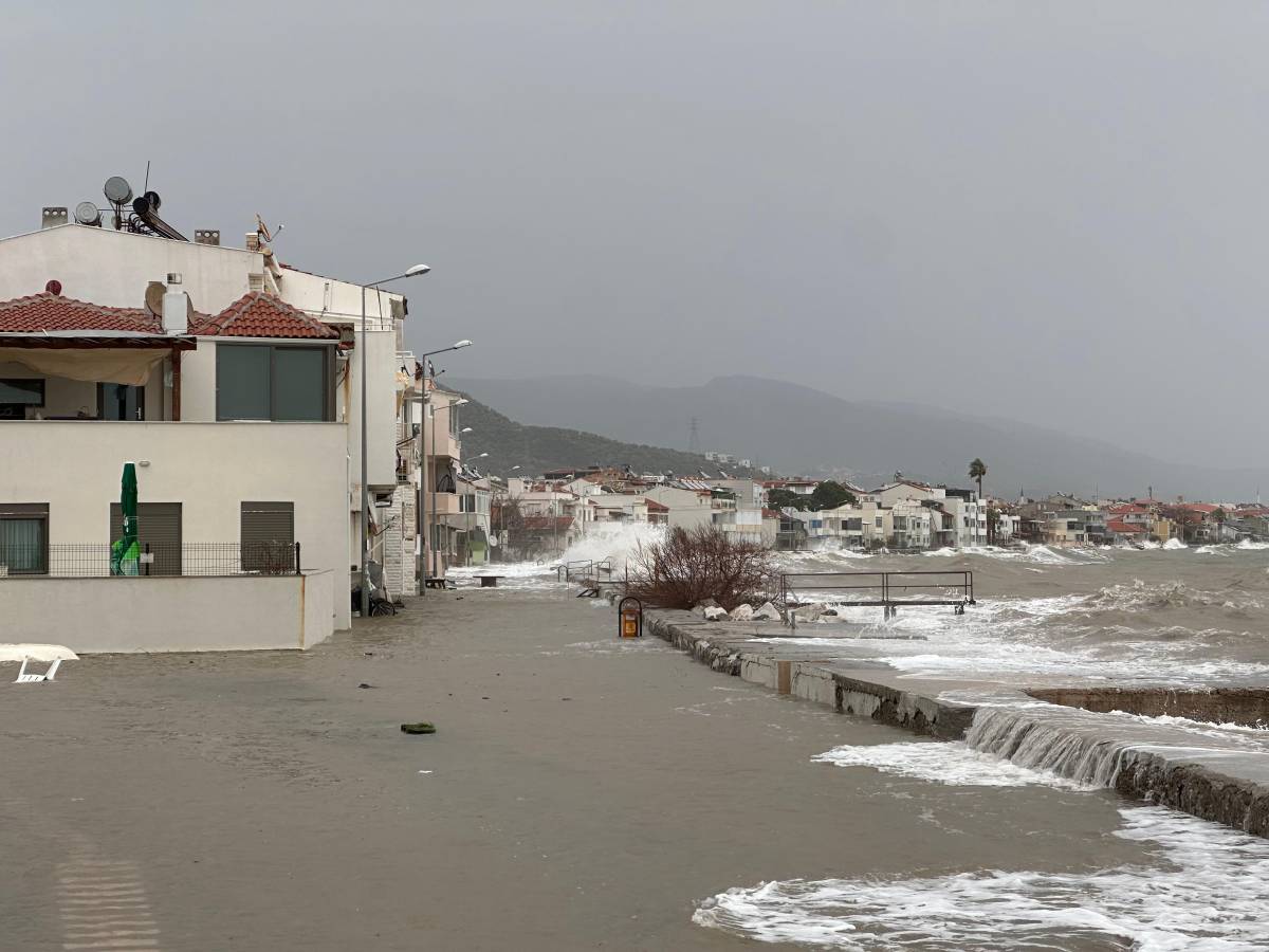 Çanakkale’nin Ayvacık ilçesinde etkili olan lodos fırtınası, sahil kesiminde hayatı olumsuz etkiledi. İlçeye bağlı Küçükkuyu beldesinde şiddetli rüzgarla birlikte yükselen dalgalar kıyıyı aşarak yerleşim alanlarına kadar ulaştı. Dalgaların boyunun 2 metreyi aştığı belirtilirken, sahil şeridi büyük ölçüde sular altında kaldı.