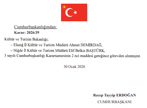 Elazığ ve Niğde İl Kültür ve Turizm Müdürlüklerinde yapılan görevden alma işlemleri, Resmî Gazete’de yayımlanan 2026/39 sayılı karar ile kamuoyuna duyuruldu. Böylece her iki ildeki görev değişiklikleri resmiyet kazanmış oldu.
