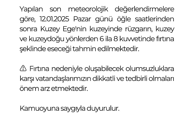 Meteorolojik değerlendirmelere göre, 12 Ocak 2025 Pazar günü öğle saatlerinden itibaren Kuzey Ege'nin kuzeyinde rüzgarın kuzey ve kuzeydoğu yönlerden saatte 50-75 km hızla (6 ila 8 kuvvetinde) fırtına şeklinde eseceği tahmin ediliyor.