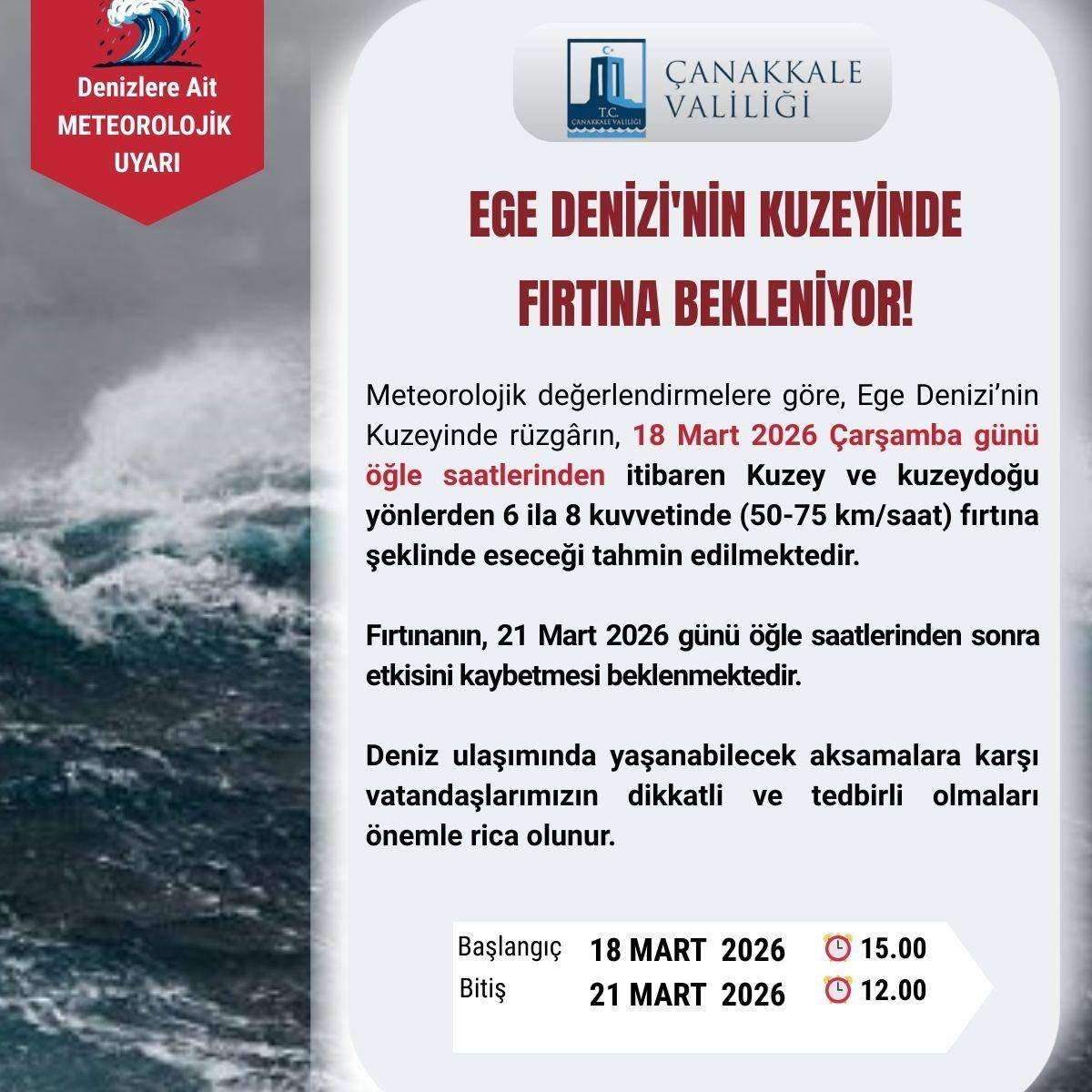 Yapılan açıklamaya göre, 18 Mart 2026 Çarşamba günü öğle saatlerinden itibaren rüzgârın kuzey ve kuzeydoğu yönlerden 6 ila 8 kuvvetinde eseceği tahmin ediliyor. Bu değerlerin saatte 50 ila 75 kilometre hız aralığına karşılık geldiği belirtildi.