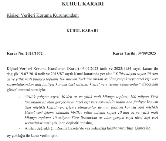 Kişisel Verileri Koruma Kurumu (KVKK), iş dünyası açısından önemli bir adım attı. 04 Eylül 2025 tarihli ve 2025/1572 sayılı Kurul Kararı ile, veri sorumlularını doğrudan ilgilendiren düzenleme Resmî Gazete’de yayımlandı. Karar, uzun süredir şirketler arasında merak konusu olan yükümlülükleri yeniden şekillendirdi.