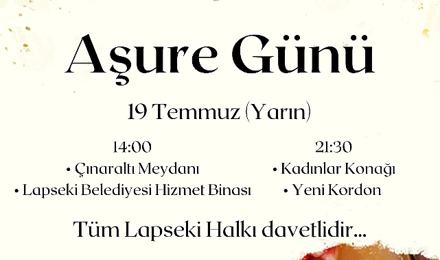 Aşure dağıtımı, 19 Temmuz (bugün) saat 14.00’te Çınaraltı Meydanı ve Lapseki Belediyesi Hizmet Binası’nda, saat 21.30’da ise Kadınlar Konağı ve Yeni Kordonda gerçekleştirilecek.