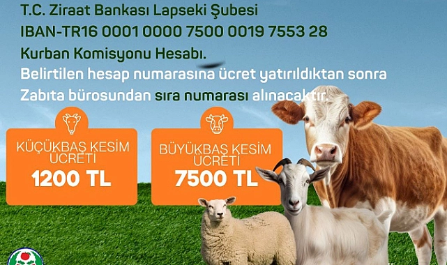 Kesim hizmetinden yararlanmak isteyen vatandaşların, belirlenen kesim ücretini aşağıda belirtilen IBAN numarasına yatırdıktan sonra Lapseki Belediyesi Zabıta Bürosu’ndan sıra numarası almaları gerekiyor.