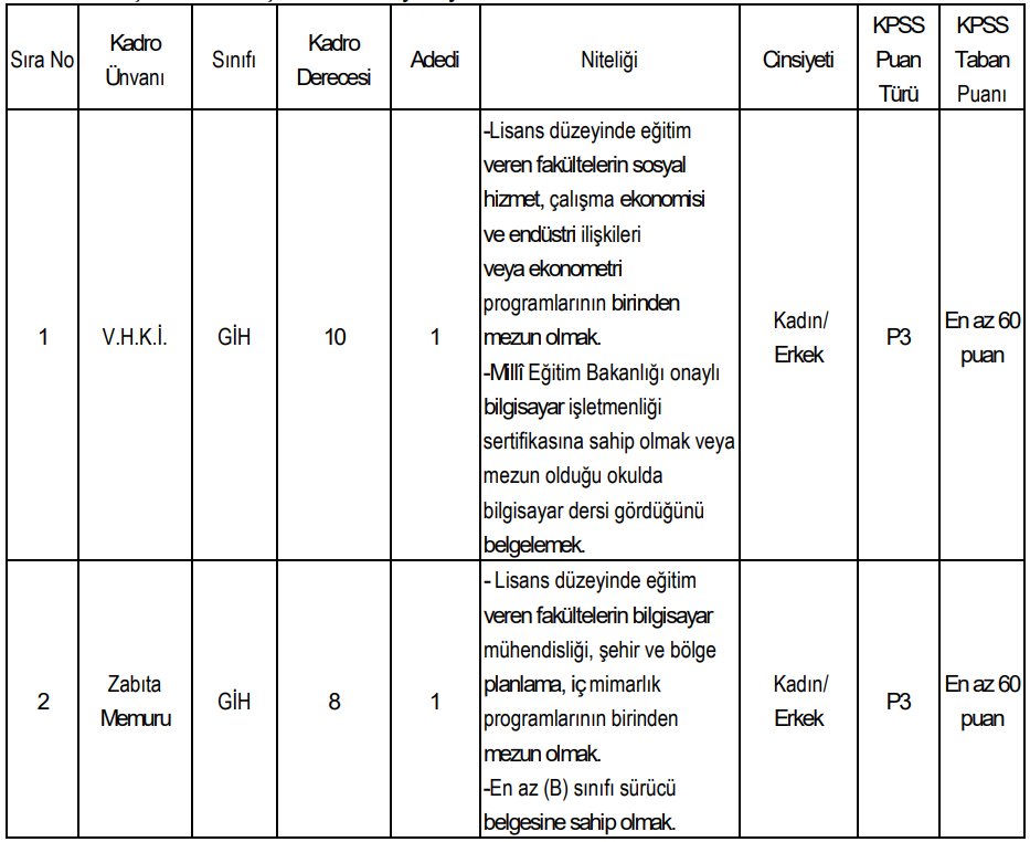 Zabıta memuru kadrosuna başvuracak adayların ise bilgisayar mühendisliği, şehir ve bölge planlama veya iç mimarlık lisans programlarından mezun olmaları gerekiyor. En az B sınıfı sürücü belgesine sahip olmak zorunlu tutulurken, KPSS P3 puan türünden en az 60 puan alma şartı da ilanda yer alıyor.