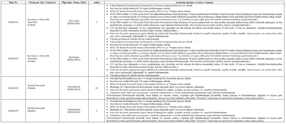 Toplamda 15 sözleşmeli personel, üniversitenin farklı birimlerinde görevlendirilecek.