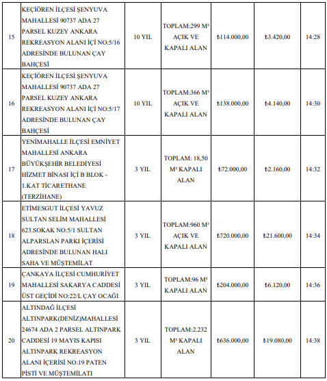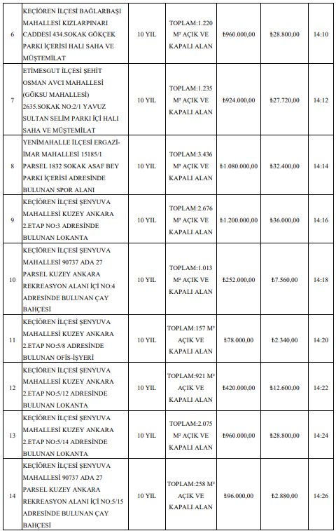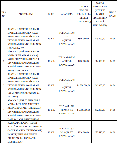 İhale listesinde Ankara’nın farklı ilçelerinde bulunan taşınmazlar yer aldı. Sincan, Keçiören, Etimesgut, Yenimahalle, Kahramankazan, Çankaya ve Altındağ ilçelerinde bulunan taşınmazlar, yatırımcıların ve işletmecilerin ilgisine sunuldu. Özellikle rekreasyon alanları içerisindeki lokanta, kafeterya, düğün salonu ve halı sahalar dikkat çekti.