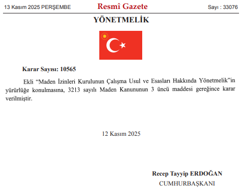 13 Kasım 2025 tarihli Resmî Gazete’de yayımlanan Cumhurbaşkanı Kararı ile “Maden İzinleri Kurulunun Çalışma Usul ve Esasları Hakkında Yönetmelik” yürürlüğe girdi. Karar, 3213 sayılı Maden Kanunu’nun 3. maddesi gereğince alınırken, maden sektöründe izin süreçlerinin şeffaf ve düzenli yürütülmesini amaçlıyor.