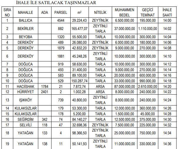 Satışa sunulan taşınmazlar arasında Ballıca, Bekirler, Beyoba, Dereköy, Doğuca, Hacıishak, Hürriyet, Işıklı, Kulaksızlar, Seğirdim, Selvilli ve Yatağan gibi mahallelerdeki çeşitli büyüklükteki araziler bulunuyor. Nitelikleri arsadan zeytinli tarlaya kadar değişen bu taşınmazlar, yatırım yapmak isteyenler için farklı seçenekler sunuyor.