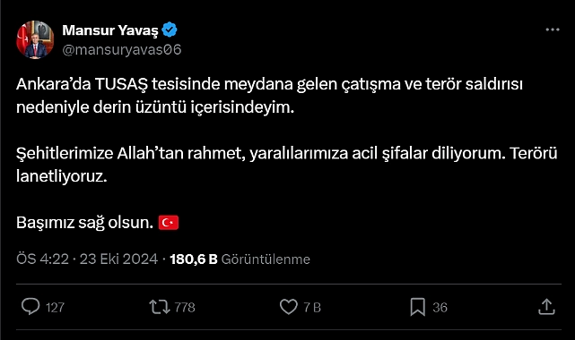 Yavaş, sosyal medya hesabından yaptığı açıklamada, "Ankara’da TUSAŞ tesisinde meydana gelen çatışma ve terör saldırısı nedeniyle derin üzüntü içerisindeyim. Şehitlerimize Allah’tan rahmet, yaralılarımıza acil şifalar diliyorum. Terörü lanetliyoruz. Başımız sağ olsun" ifadelerine yer verdi.