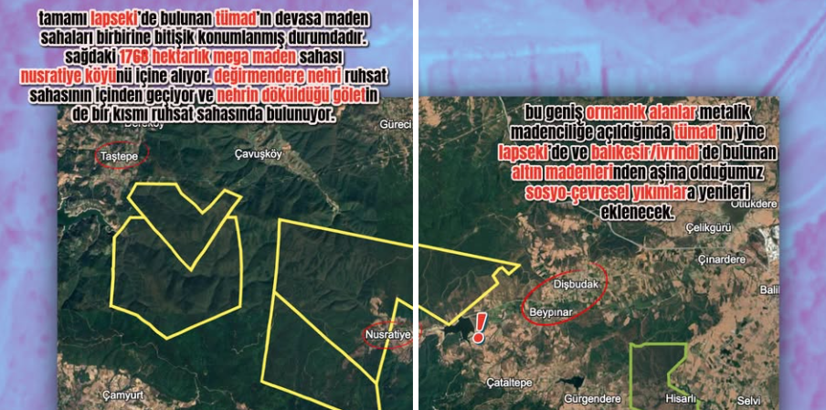 Polen Ekoloji, Lapseki ve Balıkesir/İvrindi’de TÜMAD işletmelerinin geçmiş uygulamalarına dikkat çekerek, geniş ormanlık alanların metalik madenciliğe açılması hâlinde mevcut sosyo-çevresel tahribatların büyüyerek devam edeceği uyarısında bulunuyor.