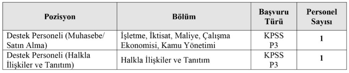 Ajans ayrıca 2 Destek Personeli alımı gerçekleştirecek. Bu kapsamda;