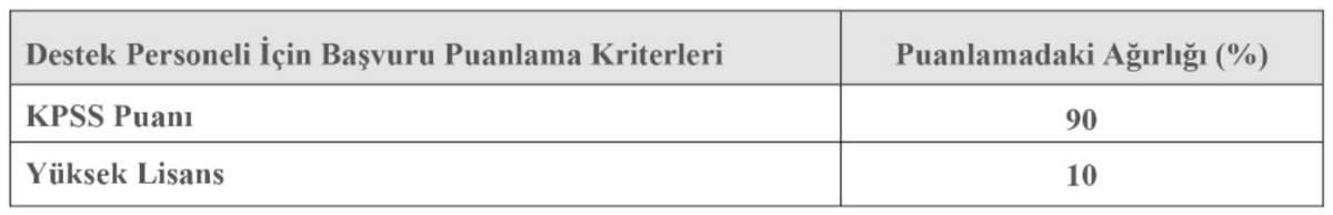 istihdam edilecek. Destek personeli adaylarının KPSS P3 puan türünden en az 60 puan almış olması yeterli olacak. Yüksek lisans mezuniyeti, değerlendirmede ek avantaj sağlayacak.