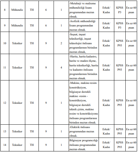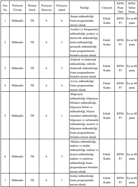 Tekniker pozisyonları ise inşaat, harita, makine, elektrik ve bilgisayar programcılığı önlisans programlarından mezun adaylar arasından seçilecek. Her pozisyon için KPSS taban puanı en az 60 olarak belirlendi.