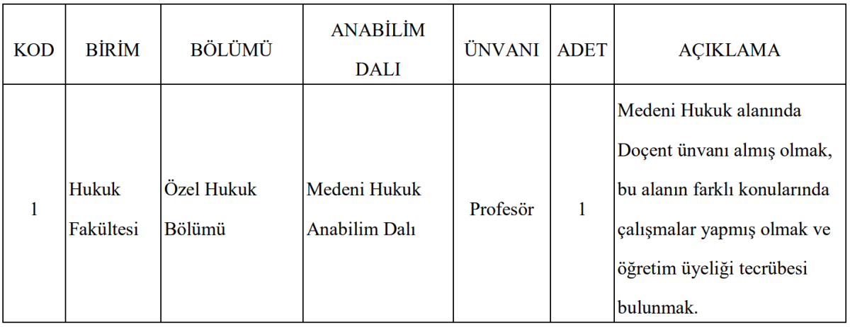 Profesör kadrosuna başvurmak isteyen adayların, Medeni Hukuk alanında doçent unvanına sahip olmaları gerekiyor. Ayrıca bu alandaki farklı konularda akademik çalışmalar yapmış ve öğretim üyeliği tecrübesi bulunan kişiler başvuru yapabilecek.