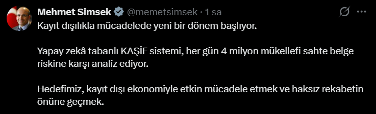 Hazine ve Maliye Bakanı Mehmet Şimşek, kayıt dışı ekonomiyle mücadelede önemli bir dönüm noktasına girildiğini açıkladı. Yapay zekâ tabanlı yeni analiz sistemi KAŞİF’in devreye alınmasıyla birlikte, vergi kayıp ve kaçaklarının önlenmesine yönelik denetimlerin daha etkin, hızlı ve kapsamlı bir yapıya kavuştuğu belirtildi. Bakan Şimşek’in verdiği bilgilere göre, sistem günlük olarak milyonlarca mükellefi sahte belge ve usulsüz işlem riski açısından analiz ediyor.
