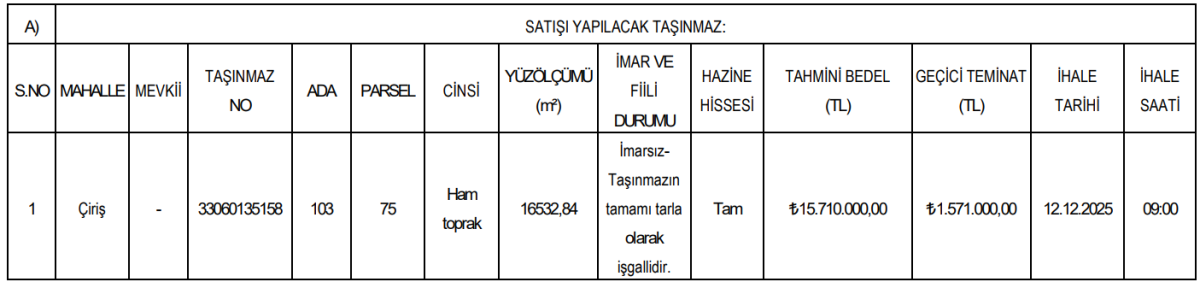 Erdemli Milli Emlak Müdürlüğü, Çiriş Mahallesi mevkiinde yer alan ve 16.532,84 m² yüzölçümüne sahip ham toprağı, 2886 Sayılı Devlet İhale Kanunu’nun 45. maddesi uyarınca açık teklif usulüyle satışa çıkarıyor.