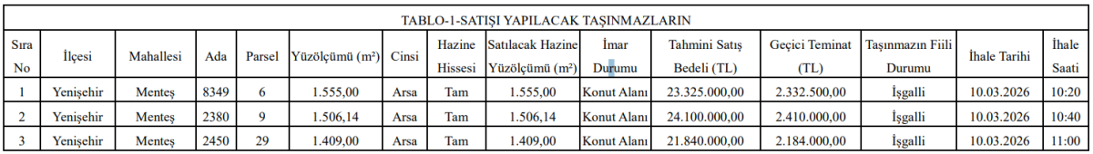 Satışa konu taşınmazların tamamı Yenişehir ilçesi Menteş Mahallesi’nde yer alıyor. Parsel bilgileri ve büyüklükleri şu şekilde: