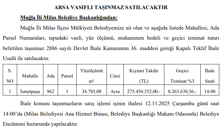 Satış işlemi, 12 Kasım 2025 Çarşamba günü saat 14:00’da Milas Belediyesi Ana Hizmet Binası’nda, Belediye Encümeni huzurunda yapılacak. İhaleye katılmak isteyenler için geçici teminat bedeli ise 8.263.630,56 TL olarak belirlendi.