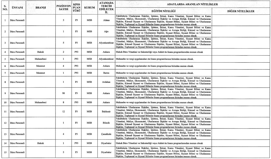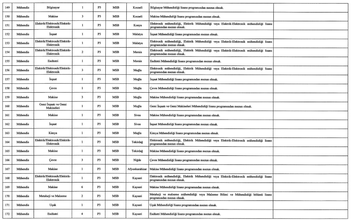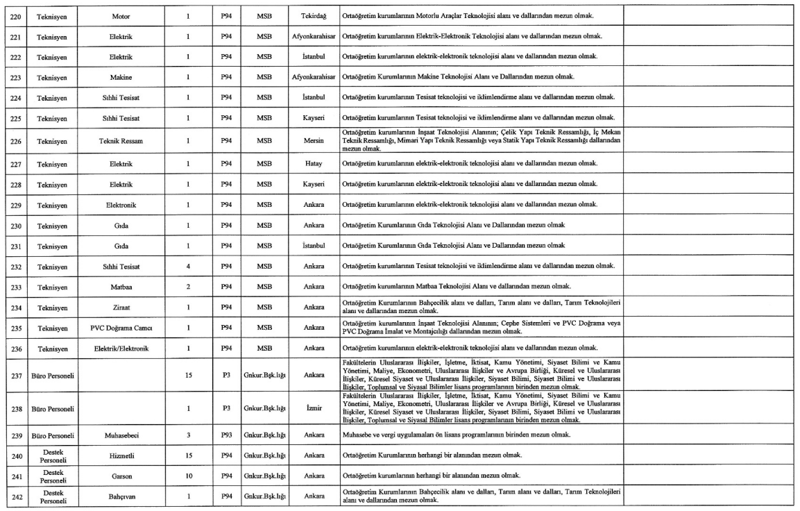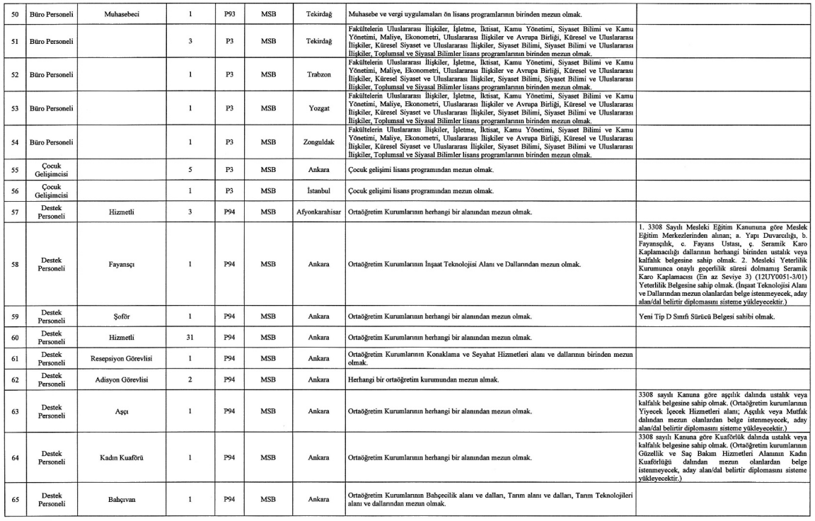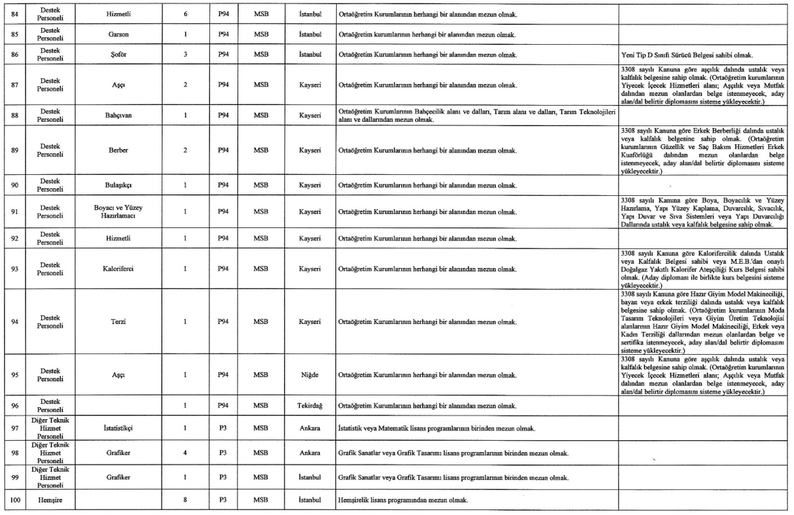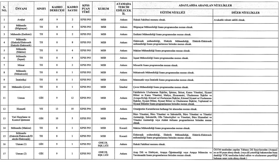 Milli Savunma Bakanlığı (MSB), Genelkurmay Başkanlığı, Kuvvet Komutanlıkları ve Milli Savunma Üniversitesi bünyesinde görevlendirilmek üzere devlet memuru ve sözleşmeli personel alımı yapacağını duyurdu. Alımlar, 657 sayılı Devlet Memurları Kanunu ile ilgili yönetmelikler kapsamında gerçekleştirilecek.