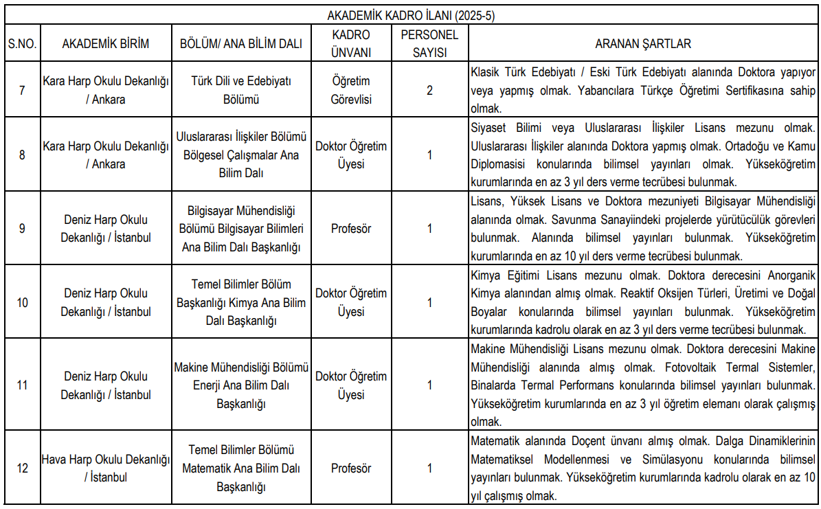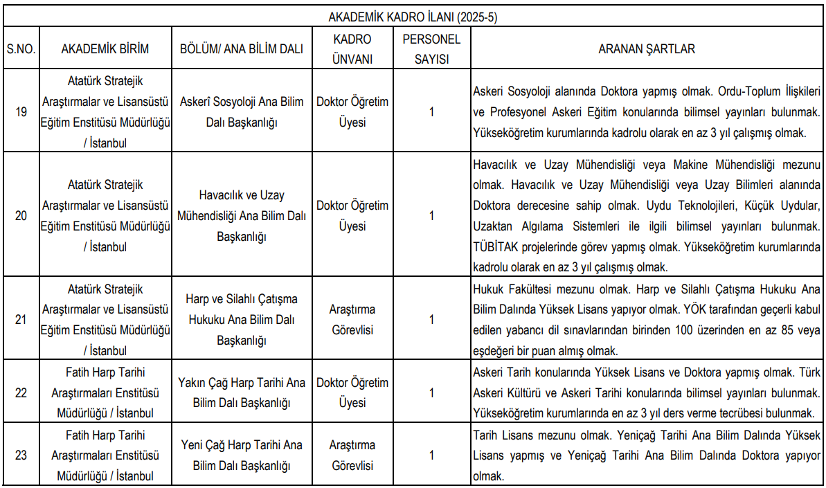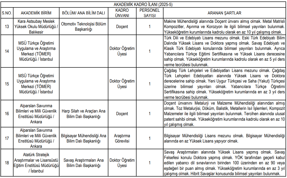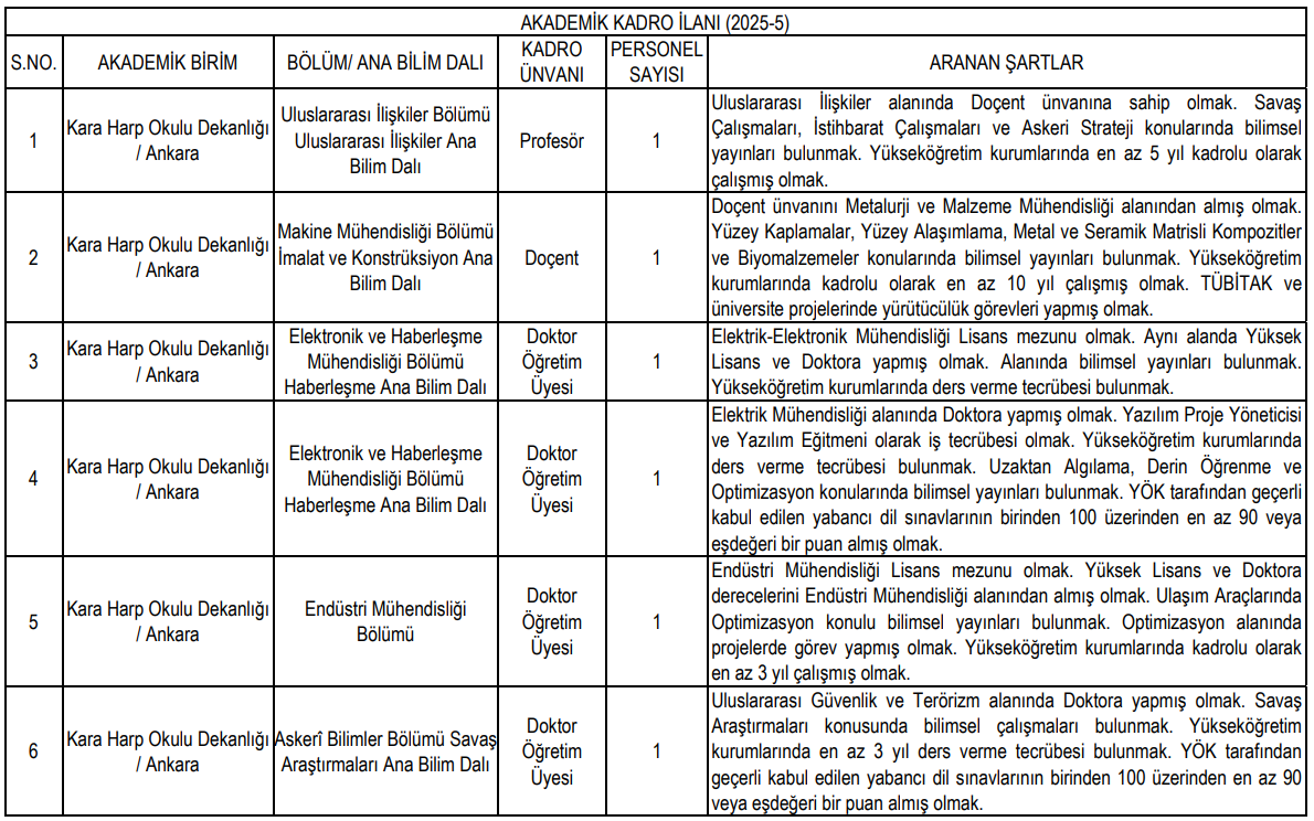 Milli Savunma Üniversitesi (MSÜ) Rektörlüğü, Resmî Gazete’de yayımlanan ilanla birlikte üniversite bünyesinde görevlendirilmek üzere sivil kaynaktan akademik personel alımı yapılacağını duyurdu. İlana göre profesör, doçent, doktor öğretim üyesi, öğretim görevlisi ve araştırma görevlisi kadrolarına başvurular kabul edilecek. Akademik kadro alımı, 6756 sayılı Kanun, 4566 sayılı Harp Okulları Kanunu, 4752 sayılı Astsubay Meslek Yüksek Okulları Kanunu ile MSÜ Akademik Personelin Seçimi, Atanması, Görevleri ve Görevde Yükseltilmesi Yönetmeliği hükümlerine göre gerçekleştirilecek.