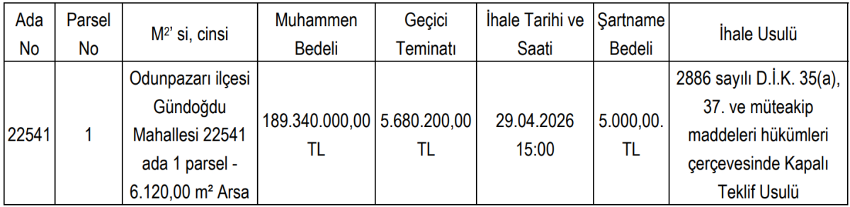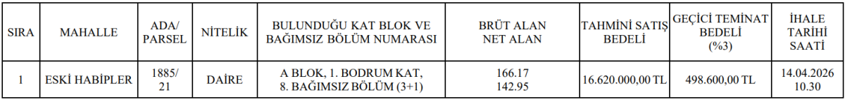 İhale, 14 Nisan 2026 tarihinde saat 10.30’da açık teklif usulüyle gerçekleştirilecek. Geçici teminat bedeli ise 498 bin 600 TL olarak açıklandı. Satış işleminin KDV’den muaf olduğu da duyurulan detaylar arasında yer aldı.
