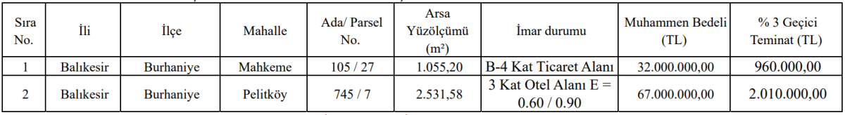 BALIKESİR BURHANİYE’DE İKİ AYRI ARSA İHALESİ