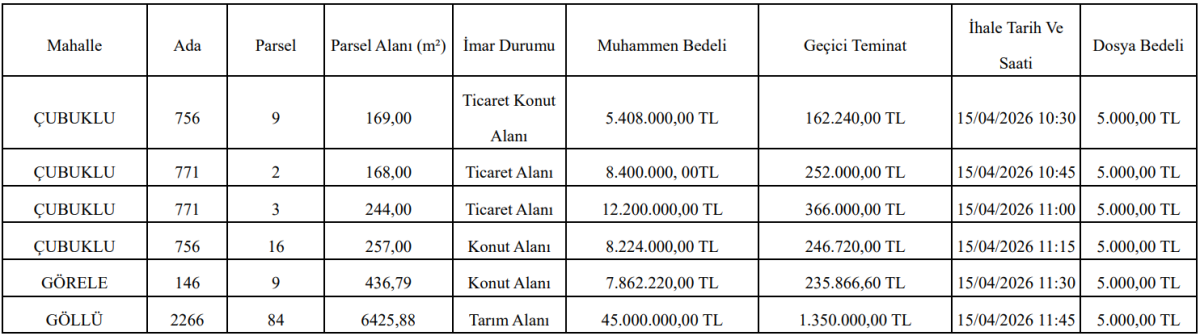 İhale tarihi 15 Nisan 2026 olarak belirlenirken, saatler taşınmazlara göre değişiklik gösteriyor. En düşük muhammen bedel 5 milyon 408 bin TL olarak açıklanırken, en yüksek bedel 45 milyon TL’ye kadar çıkıyor.