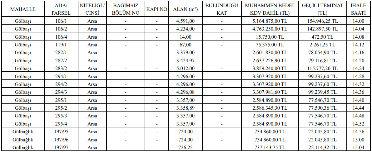 Geçici teminat tutarları ise her taşınmaz için ayrı ayrı belirlenmiş durumda.