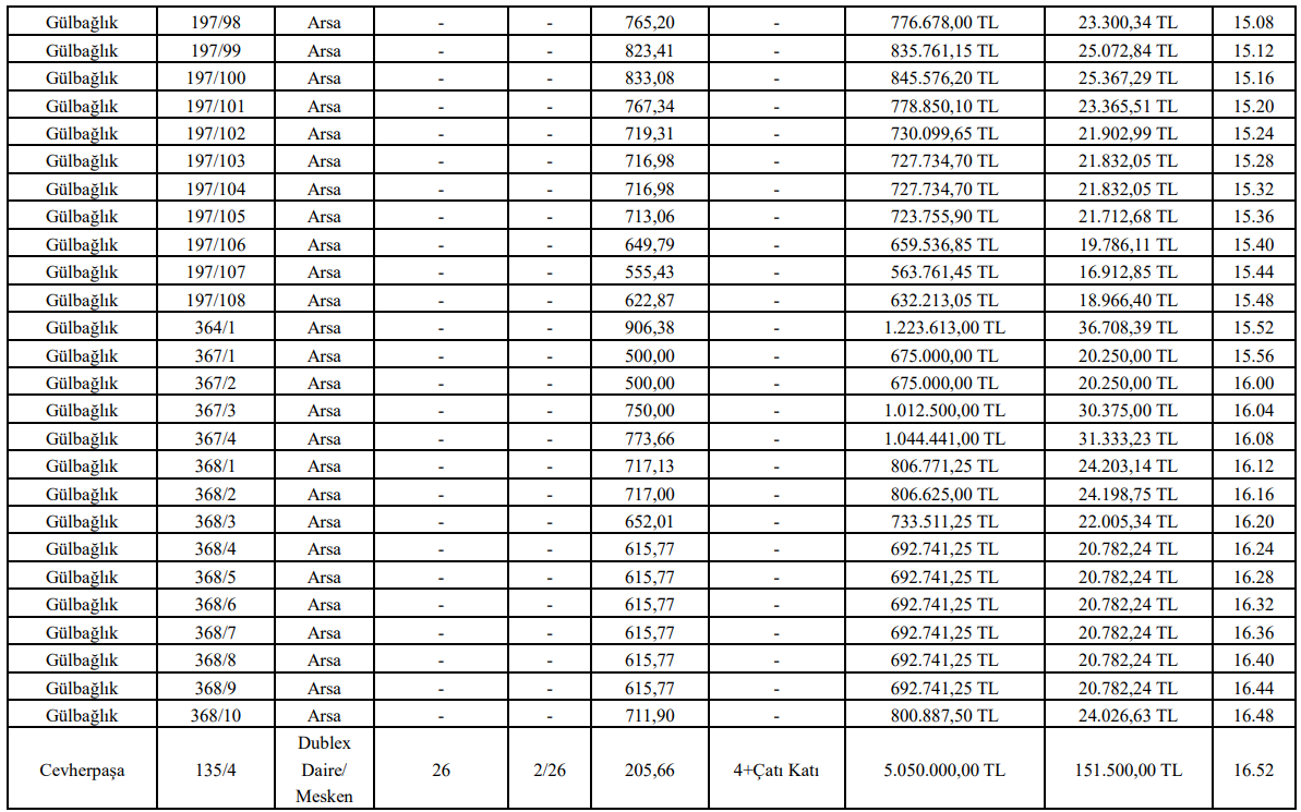 Satışa sunulan taşınmazlar arasında farklı büyüklüklerde arsalar ile bir adet dubleks daire de yer alıyor. İhale kapsamında çok sayıda parsel yatırımcıların ilgisine sunulacak.