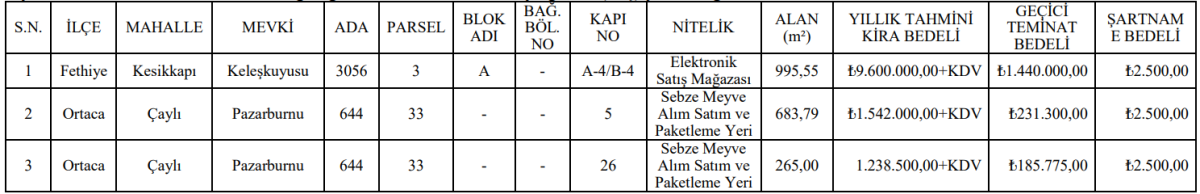 Muğla Büyükşehir Belediyesi ise mülkiyetinde bulunan üç taşınmazı kiraya vermek üzere ihale sürecini başlattı. Muğla’nın Fethiye ve Ortaca ilçelerinde bulunan taşınmazlar, 5 yıllığına kiralanacak.