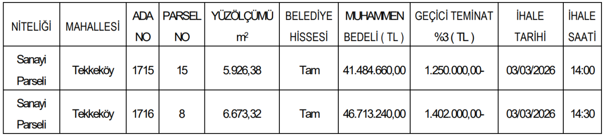 Tekkeköy Belediyesi, mülkiyeti, kullanım ve tasarruf hakkı kendisine ait iki sanayi parselini satışa çıkarıyor. İhale, 3 Mart 2026 Salı günü Belediye Meclis Salonu’nda, Encümen huzurunda gerçekleştirilecek.