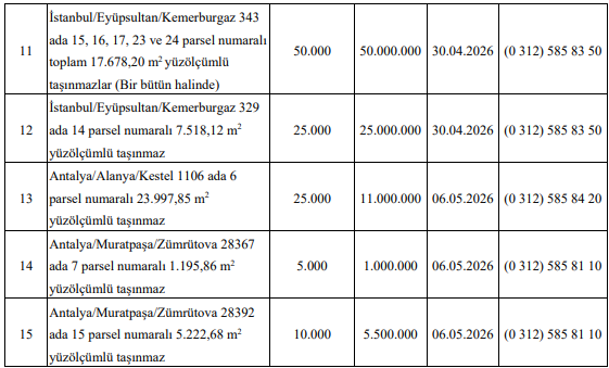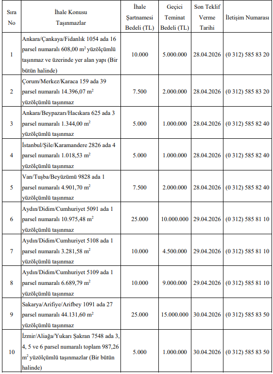 Satış listesinde Türkiye’nin farklı bölgelerinden önemli taşınmazlar yer alıyor. Özellikle büyük şehirlerdeki arsalar öne çıkıyor.