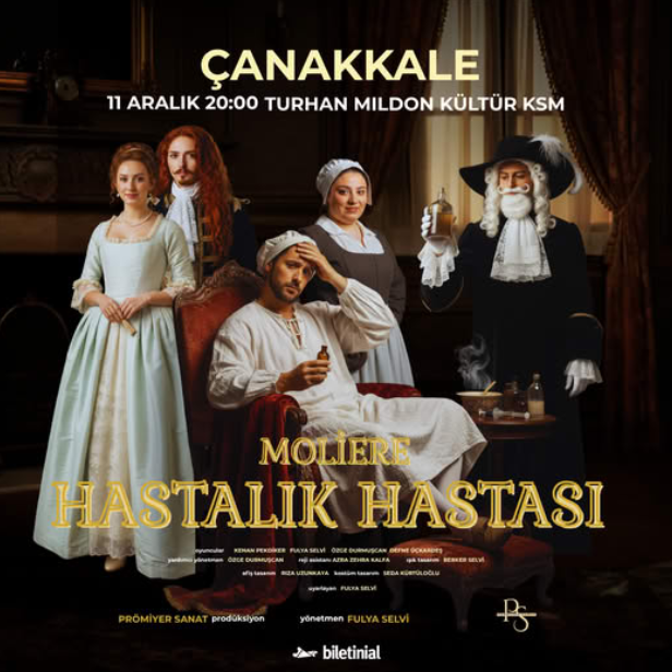 Prömiyer Sanat prodüksiyonuyla sahneye taşınan Moliere’nin klasik eseri ‘Hastalık Hastası’, güçlü kadrosu ve modern yorumuyla 11 Aralık’ta Çanakkaleli sanatseverlerle buluşmaya hazırlanıyor. Sağlık takıntısının birey ve çevresi üzerindeki etkisini mizahi bir dille ortaya koyan oyun, hem düşündüren hem de kahkaha attıran yapısıyla dikkat çekiyor.