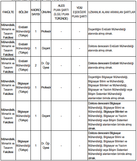 İlan kapsamında her kadro için farklı akademik uzmanlık şartları belirlendi. Endüstri Mühendisliği kadrolarında doktora ve doçentlik derecesinin ilgili alandan alınmış olması isteniyor. Bilgisayar Mühendisliği kadrolarında ise Bilgisayar Bilimi ve Mühendisliği, Bilgisayar ve Yazılım Mühendisliği veya Bilişim Sistemleri Mühendisliği gibi alanlardan alınmış doktora ya da doçentlik şartı aranıyor.