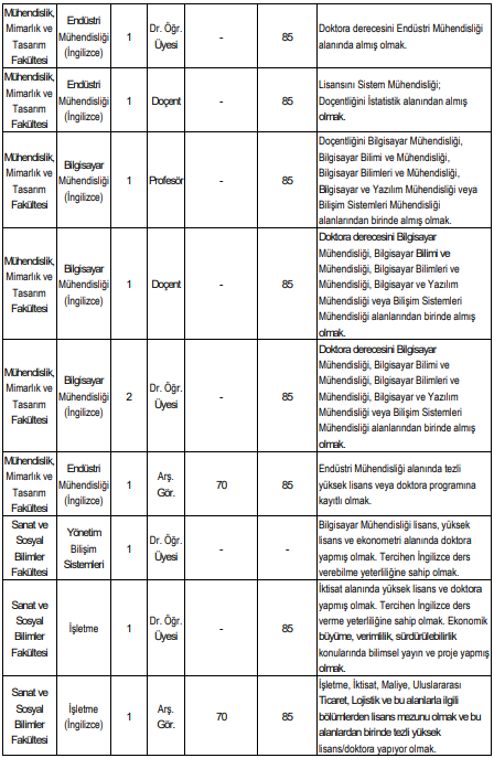 Sanat ve Sosyal Bilimler Fakültesi’ndeki bazı kadrolarda disiplinler arası uzmanlık dikkat çekiyor. Örneğin Yönetim Bilişim Sistemleri için bilgisayar mühendisliği lisans ve yüksek lisans derecesine ek olarak ekonometri alanında doktora şartı aranıyor. İşletme kadrosunda ise iktisat alanında yüksek lisans ve doktora yapmış olmak, ekonomik büyüme ve sürdürülebilirlik konularında yayın sahibi olmak gerekiyor.