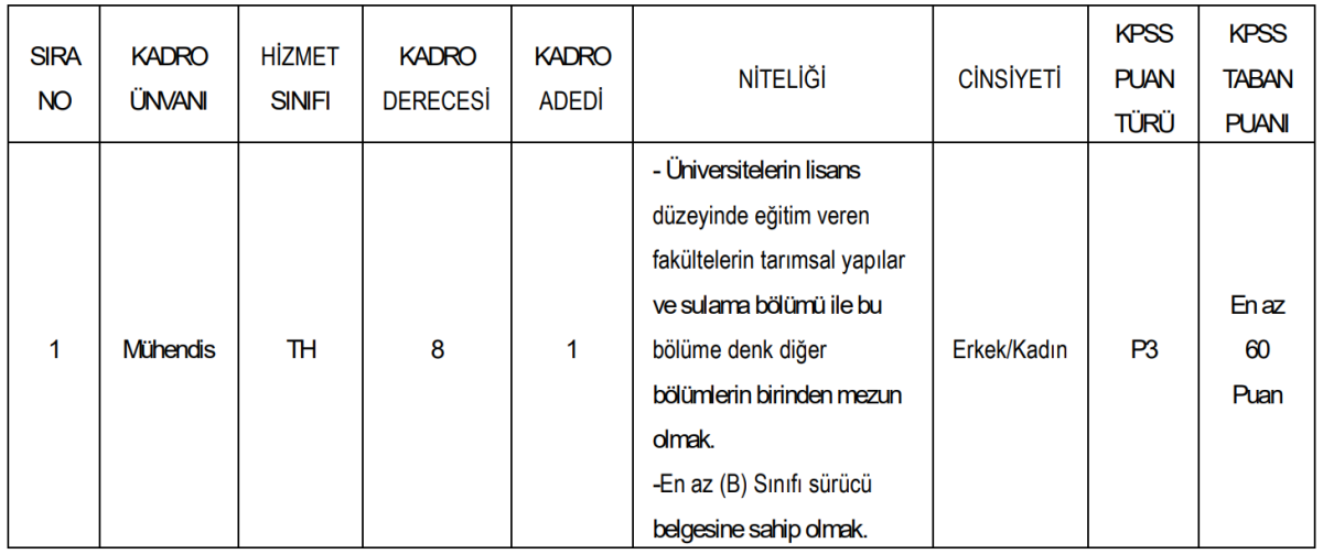 Mühendis kadrosuna başvuracak adayların, üniversitelerin lisans düzeyinde eğitim veren fakültelerinin Tarımsal Yapılar ve Sulama bölümünden veya bu bölüme denk kabul edilen diğer bölümlerden mezun olmaları gerekiyor. Ayrıca adayların, en az B sınıfı sürücü belgesine sahip olmaları şartı aranıyor. İlan edilen kadro için özel bir deneyim şartı belirtilmedi.