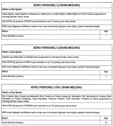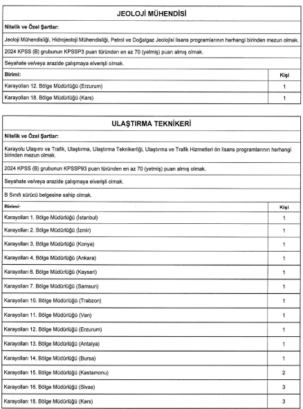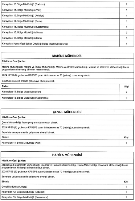 KGM’nin ilanına göre alım yapılacak başlıca pozisyonlar şu şekilde sıralanıyor: