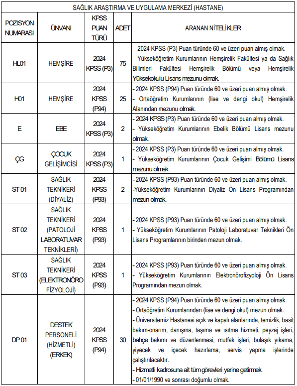 Alım, özellikle Sağlık Araştırma ve Uygulama Merkezi (Hastane) başta olmak üzere İdari ve Mali İşler Daire Başkanlığı ile Yapı İşleri ve Teknik Daire Başkanlığı kadrolarını kapsıyor. Hem sağlık personeli hem de destek ve teknik personel alımının yapılacak olması, ilanı geniş bir aday kitlesi için dikkat çekici hale getiriyor.