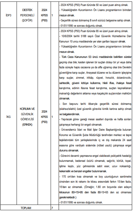 olmak üzere 7 kişilik kadro açıldı. Güvenlik görevlisi pozisyonu için boy-kilo şartı, özel güvenlik kimlik kartı ve vardiyalı çalışmaya uygunluk gibi detaylı özel şartlar dikkat çekiyor.