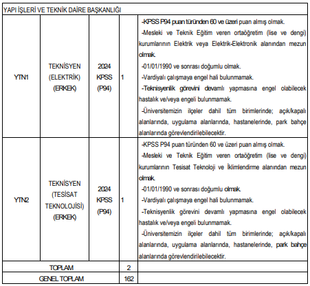 alanlarında 2 erkek personel istihdam edilecek. Bu kadrolar için mesleki ve teknik lise mezunu olma şartı aranıyor.
