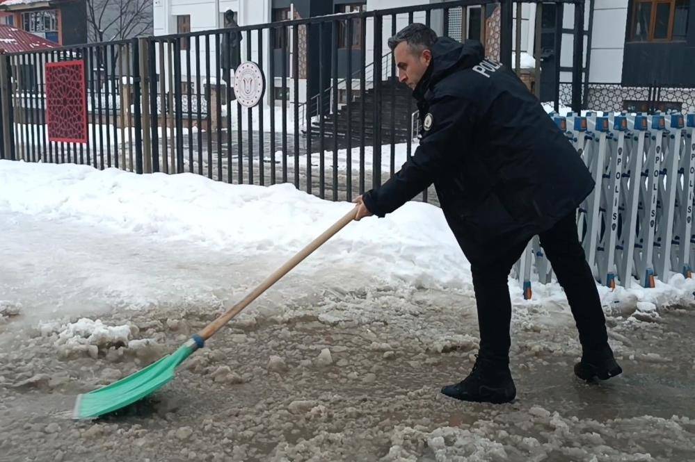 Muş'ta cadde ve kaldırımlarda biriken kar sularını kürekle temizleyen polisin örnek davranışı takdir topladı.
